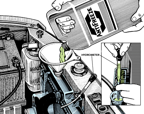At least the auto parts store is on the way home, all the better to pick up a couple of jugs of antifreeze. But what kind? The parts store now stocks three colors: yellow, green and orange. Huh? Isn't all antifreeze green? Isn't it all the same? Bad News, Good News The bad news is that it doesn't come down to color matching. Isn't all antifreeze compatible? Sorry, but it isn't. There are a few cases where you can get a fast case of corrosion, some where the water pump can be both eroded and corroded to an early death, and a lot of cases where you can shorten the effective life of the antifreeze. Antifreeze itself (most commonly a chemical called ethylene glycol) doesn't wear out–ever–but the key ingredients are the rust and corrosion inhibitors, and they get used up. The most common inhibitors, silicates for aluminum protection, are used up faster than others. That's why some new cars (all General Motors, Mercury Cougar, VW/Audi models) have red or orange antifreeze with a new class of inhibitors, called organic acids. Examples of U.S. brands with these organic acids: Havoline Dex-Cool and Prestone Extended Life, both recommended for five years or 150,000 miles. That's the good news. Fill 'Er Up How about just pouring orange antifreeze into every cooling system, say, yours? Sorry, but it's not that simple. The new organic acid antifreezes may be used only if the cooling system has an aluminum radiator (rather than copper-and-brass). However, let's assume the reason you're thinking of a coolant change is because you're changing a cooling system part (pump, radiator, heater, thermostat housing) on a system with a conventional coolant, not an organic acid orange or pink. In that case, don't change to organic acid orange, even if the part you're installing is aluminum. Use a fresh fill of familiar U.S. yellow/gold or green silicated antifreeze. The two orange extended-life antifreezes are compatible with each other, with what's factory-fill in GM ca rs and the '99 Mercury Cougar, and with the pink in VW/Audi cars. However, they're not compatible with a special orange antifreeze in 1998-99 Chrysler L/H cars (Dodge Intrepid/Chrysler Concorde and 300M), a special "hybrid" mix of organic acids and silicates. The green in most Japanese cars contains no silicates, so it's not the same as the green in the parts store. The yellow in some European cars contains some silicates, but it's very different from yellow Prestone, the top-selling U.S. brand. And then there is red antifreeze used by Toyota, and blue used on some European and Korean cars. Freshen Up That Cup For You, Sir? What about just topping up a system that's low? What kind should you use? If the system (except for Chrysler L/H) has orange or pink, use Prestone or Havoline orange for top-up. All you have on hand is regular U.S. yellow/gold or green? Well, if you're desperate, use what you've got, because it's better than running low o n coolant and possibly overheating. But the mixture is shortening the life of the antifreeze. By how much? It would take lab tests to tell, so the best deal is to do the equivalent of a "retrofit." Can you retrofit all systems? Sorry, the answer is no. What about draining green or yellow/gold from the radiator and refilling with orange? Is that considered a "retrofit"? No, and you'd better not try that, either. What if the system has Japanese green, Toyota red, Korean or European blue, or European yellow? As we noted, European and Korean formulas have silicates, so U.S. green or yellow/gold is all right, but it slightly compromises the extended life formulas some have. Typically all that means is: Change at 30,000 instead of 36,000 miles. The Japanese green and red antifreezes have no silicates, but they are very different from U.S. orange. If you really drain out the old antifreeze from any of these systems (thoroughly rinse the system with fresh water), you certainly can refill with a U.S. yellow/gold or green silicated antifreeze. ![]() Refill the system to half its capacity with coolant. Then add water to fill, achieving a 50 percent concentration of coolant. Check the concentration with a hydrometer. ![]() This Thexton drain plug/petcock socket may help remove stubborn plugs. ![]() Some systems use a bleeder screw in the upper radiator hose. Remove it while refilling until the liquid bubbles out. Now let's look at "retrofit" and "drain and fill" and explain what you can and can't do safely, and a bit of why. If a vehicle has a copper-and-brass radiator, forget a retrofit, says General Motors, because the organic acid (orange) antifreeze may not provide adequate protection for the lead solder in that radiator. The Chrysler orange hybrid combination of silicates and organic acids is meant to provide special protection for the water pump. Sorry, you can buy it only at a Chrysler-brand dealer. Prestone believes you can retrofit to its organic acid orange almost any vehicle with an aluminum radiator and cooling system that has been well-maintained and is in good condition, if you do it right. H owever, the antifreeze maker recognizes the possibility of a problem with Dodge truck 5.9-liter V8 water pumps, for which green or yellow/gold U.S. antifreeze is recommended–if you don't get Chrysler's specific orange. Filling The System The idea in any case is to rinse your cooling system well, until the liquid is clear water. The radiator may hold less than a third of the coolant. The radiator may have an air bleed or plug on top of the tank or the side, and if it does, open or remove it. Next, open the drain cock. Collect the coolant in a pan. Next, disconnect the lower radiator hose from the radiator and let coolant drain from the block. Third, disconnect the hoses from the heater core, attach auxiliary hoses to the core necks and force a garden hose nozzle into one hose. Run plain water through that hose until clear water comes out the other. If there are coolant hoses connected to the intake manifold or thr